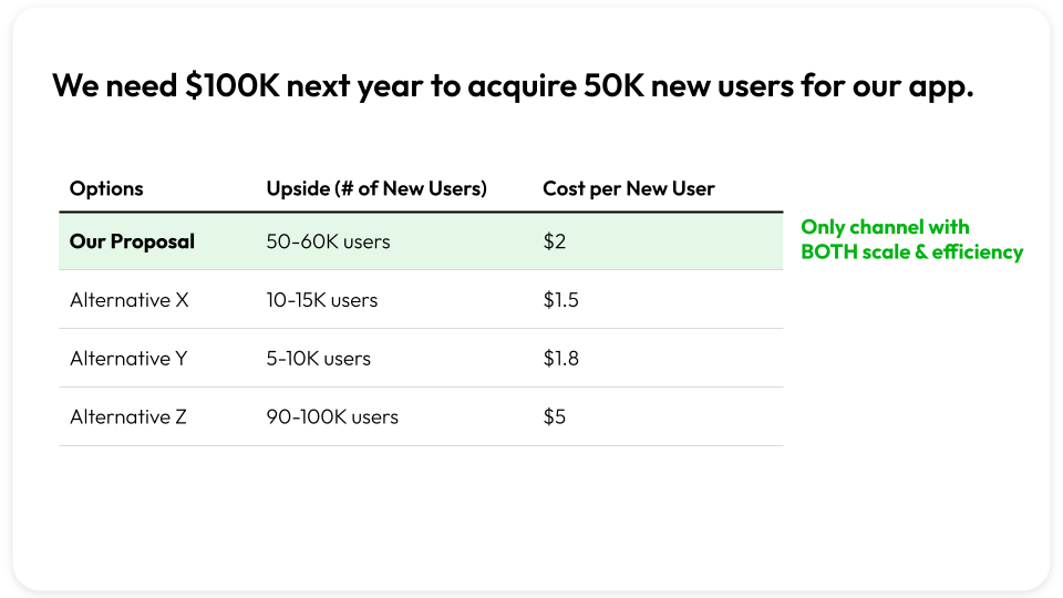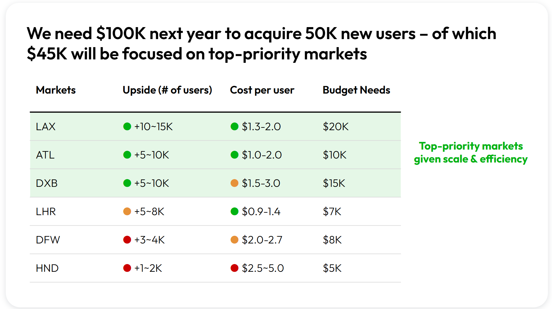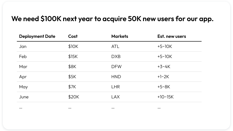 Imagine that you're planning a user acquisition campaign for next year, and you're pitching your leadership to secure budgets.