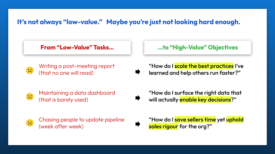 In other words: some tasks might appear to be low-value – only because you treated them as nothing more than just tasks.